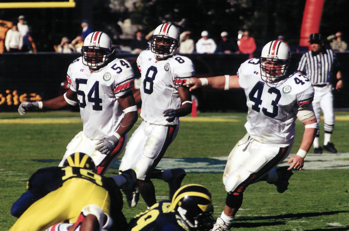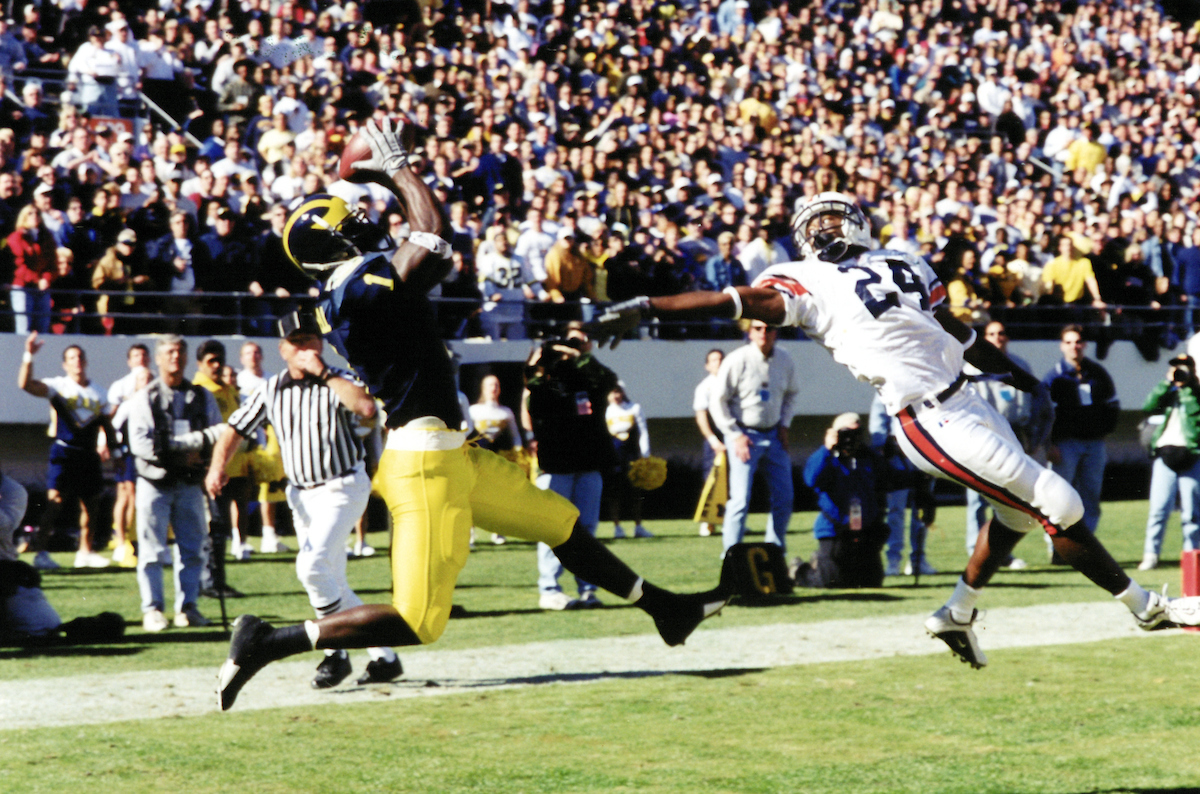 Michigan quarterback Drew Henson threw for 294 yards and two TDs for the benefit of receivers David Terrell (136 yards) and Marquis Walker (100 yards) – the first receiving tandem to reach the 100-yard mark since 1968.
