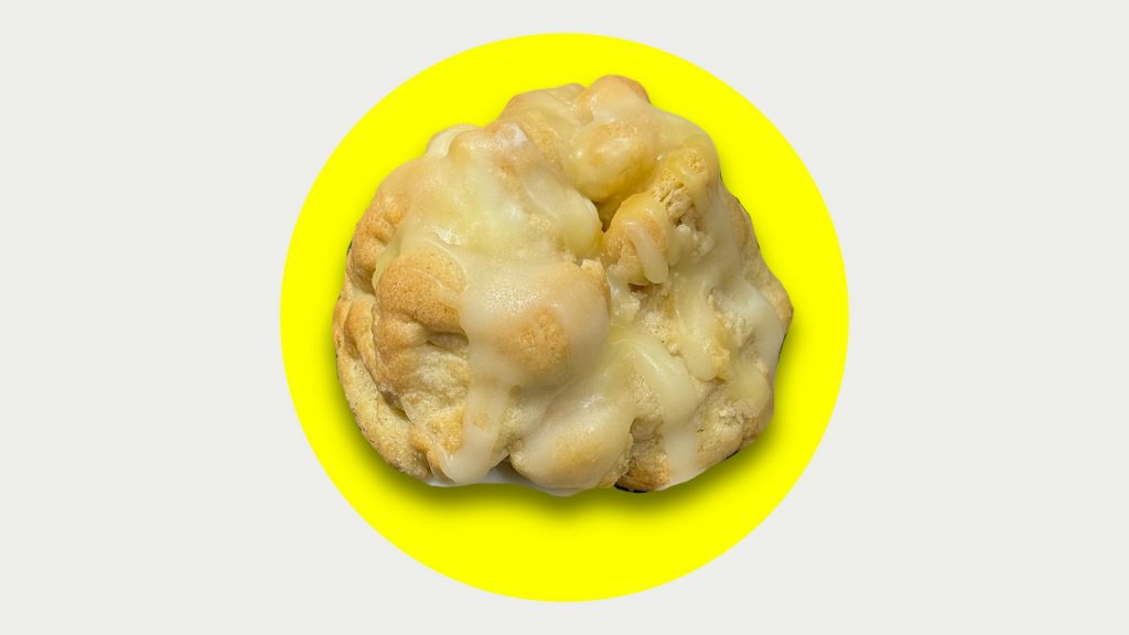 Lemon cookie dough mixed with creamy white chocolate chips and drizzled with fresh lemon glaze
