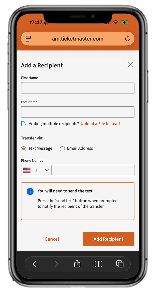 You can choose to either send the ticket(s) through text message (Step 3) or through email.